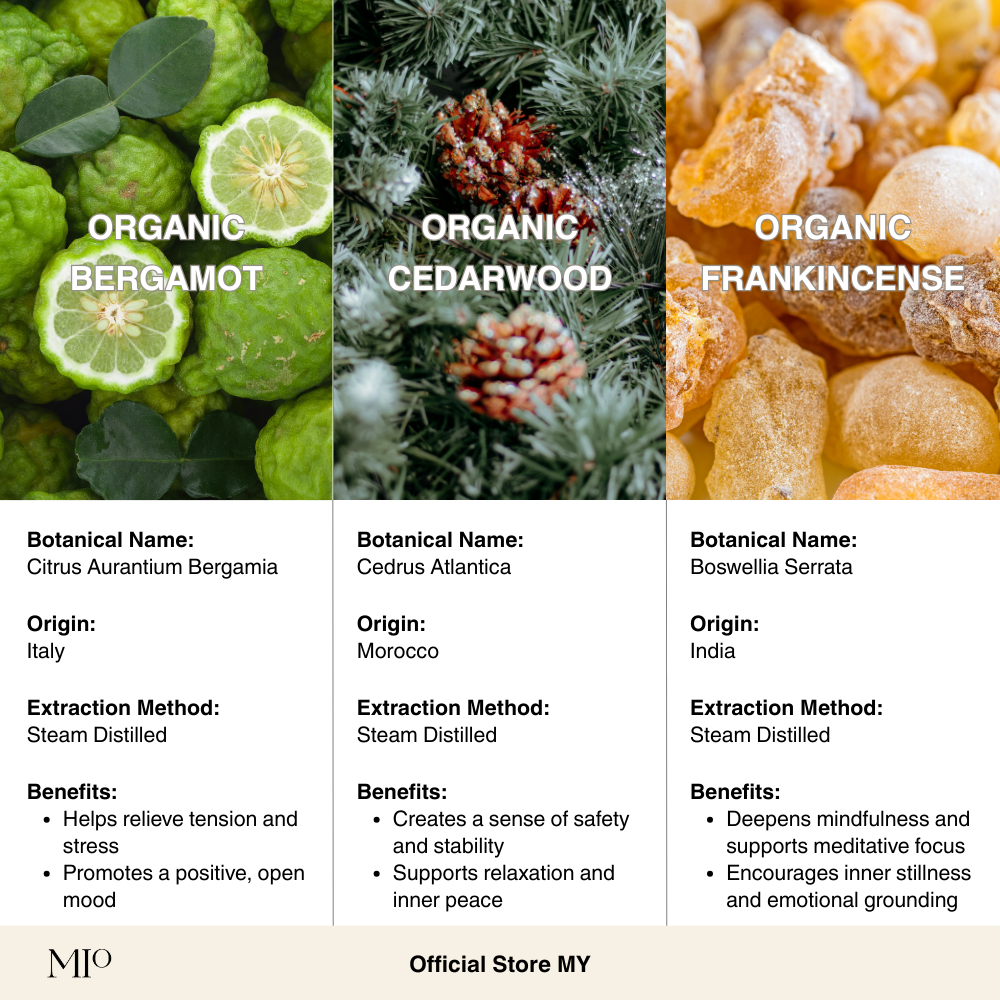 Citrus Aurantium Bergamia (Bergamot) Peel Oil*, Boswellia Serrata (Frankincense) Oil*, Cedrus Atlantica (Atlas Cedarwood) Wood Oil*
