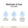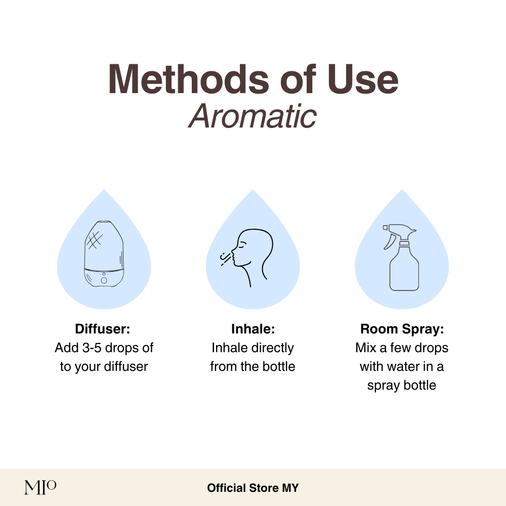 Aromatic – Add 3-5 drops per 100ml of water into the diffuser.
