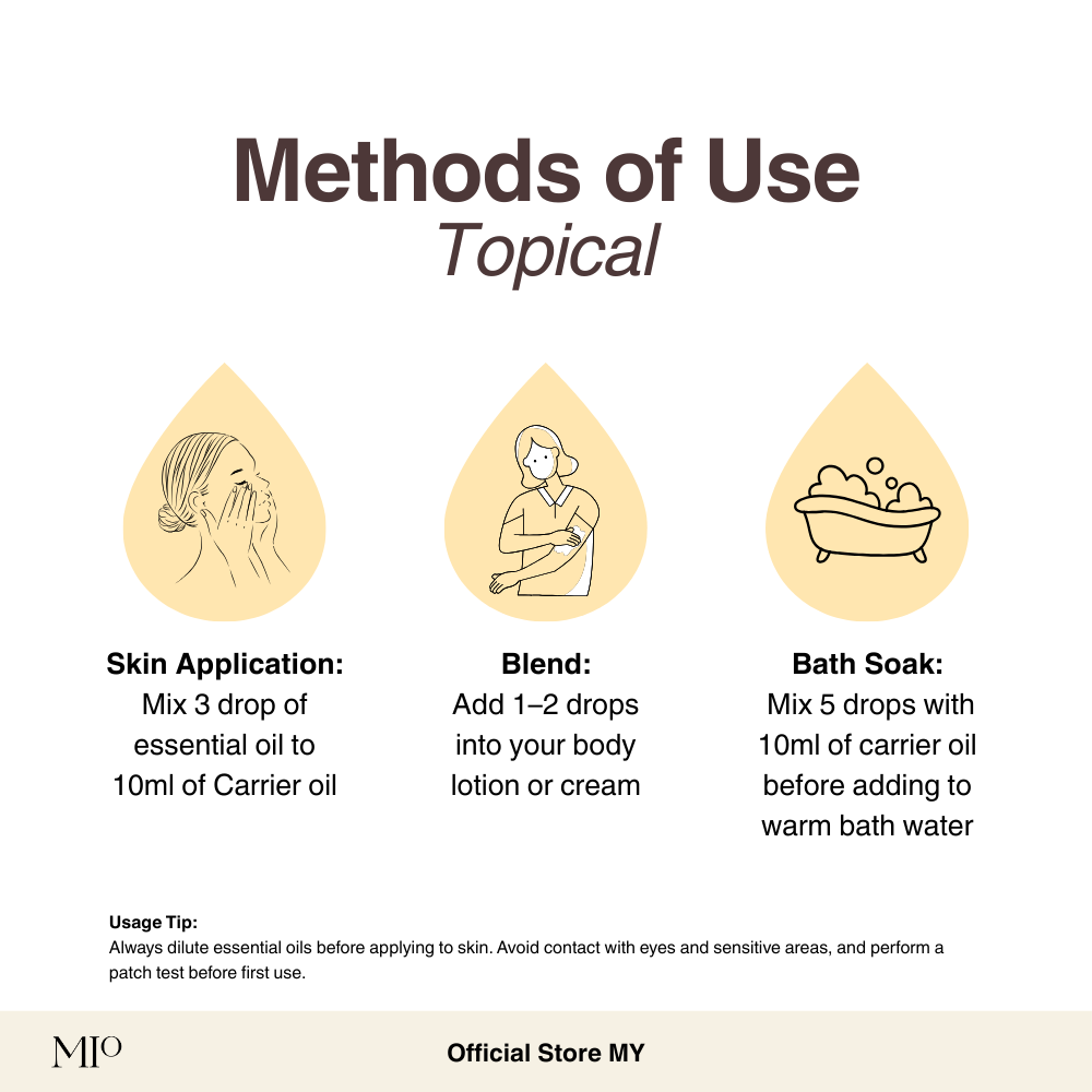 Topical – Dilute to 2% in a carrier (EO 6 drops + Carrier 10ml).