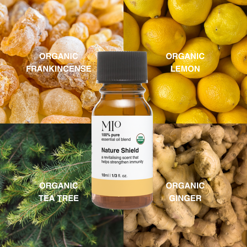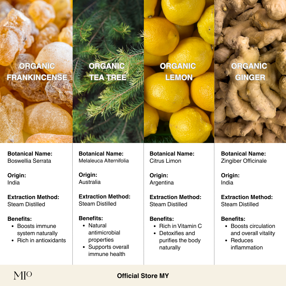 Boswellia Serrata (Frankincense) Oil*, Citrus Limon (Lemon) Peel Oil*, Eucalyptus Globulus Leaf Oil*, Melaleuca Alternifolia (Tea Tree) Leaf Oil*, Zingiber Officinale (Ginger) Root Oil*